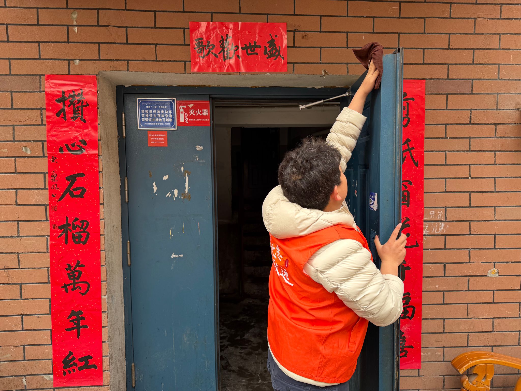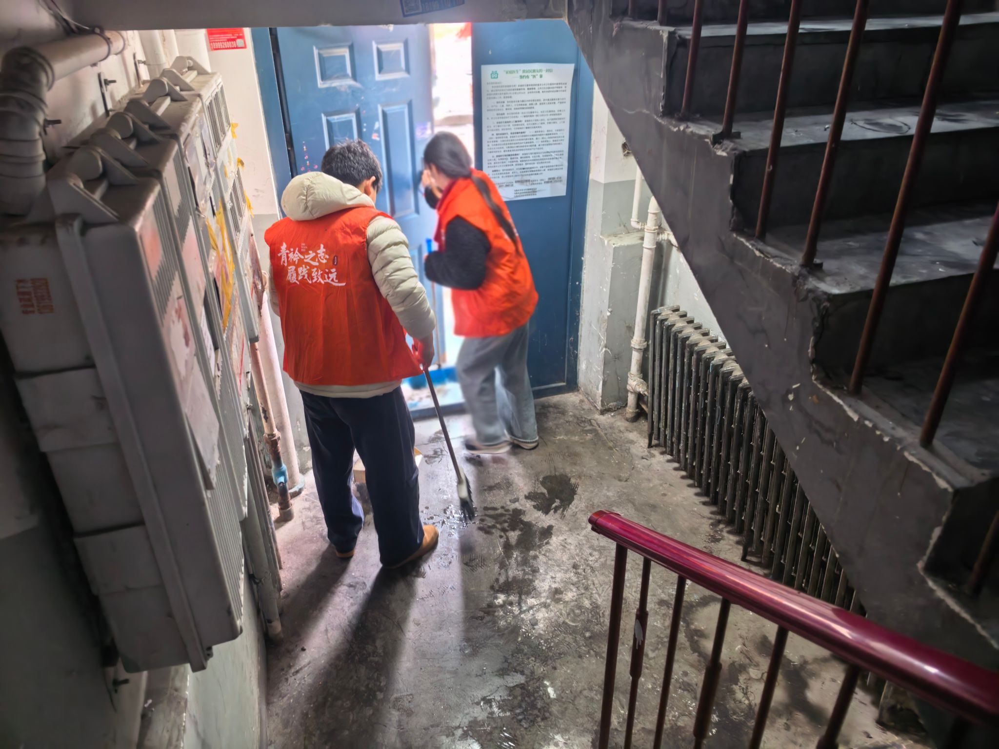 参观结束后,全体党员化身志愿服务者,深入社区楼栋开展环境卫生集中整治行动,对楼栋楼道地面进行全面拖洗,对楼梯扶手、公共管道、单元门、墙面死角等区域进行细致擦拭和清洁。清洁过程中,党员们主动与社区居民亲切交流,耐心倾听居民需求,用实际行动践行雷锋精神与为民服务的初心。