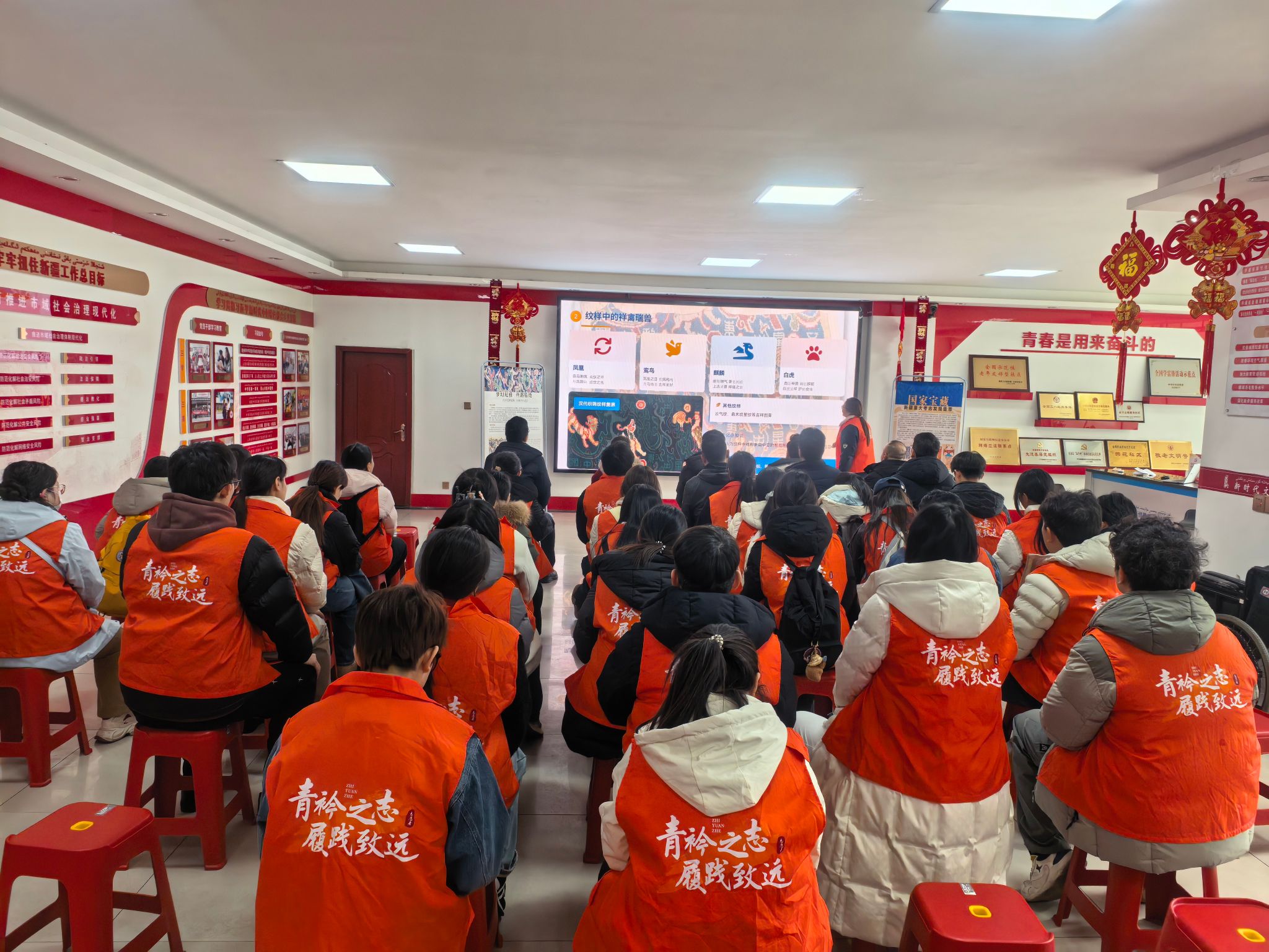 随后,本科生第一党支部“文物中的新疆故事”党建品牌讲解团队通过专题讲解、图文展示、文化解读等形式,向大家讲述了“五星出东方利中国”汉代织锦护臂的历史背景、工艺技法、文化内涵与传承价值,让党员们不仅领略了国宝文物的艺术之美与历史厚重感,也进一步增强了文化自觉与文化自信,厚植了家国情怀。