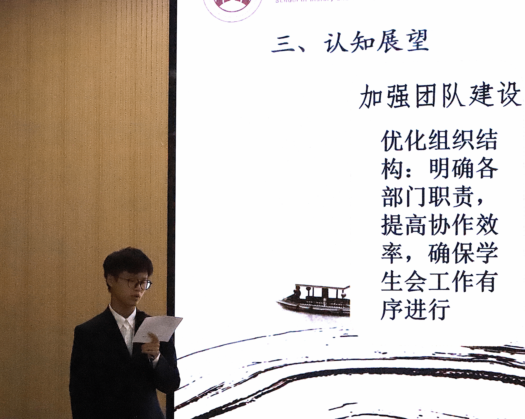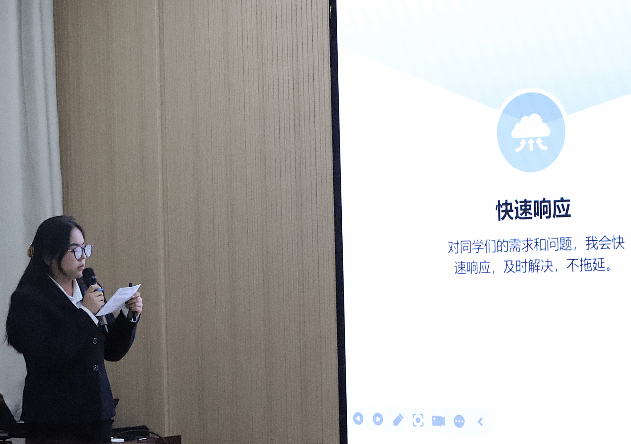 学生会主席团及各部门候选人依次进行竞选演讲。同学们围绕个人优势、工作履历、部门认知及未来规划等方面展开阐述,以饱满的热情和清晰的思路展现了服务同学的责任意识与创新理念。