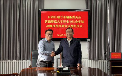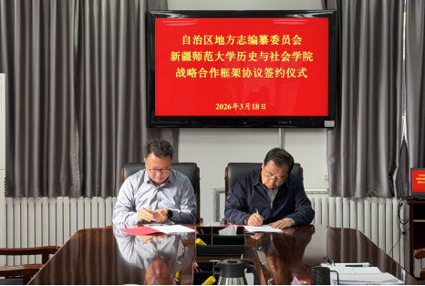 2026年3月18日17时,新疆维吾尔自治区地方志编纂委员会与新疆师范大学历史与社会战略合作框架协议签约仪式在自治区地方志编纂委员会三楼会议室举行。自治区地方志编纂委员会党组书记、副主任牛远峰等领导,新疆师范大学历史与社会学院院长罗意、巴·巴图巴雅尔教授等出席,仪式由自治区地方志编纂委员会党组成员、副主任阿里木江·阿皮孜主持。